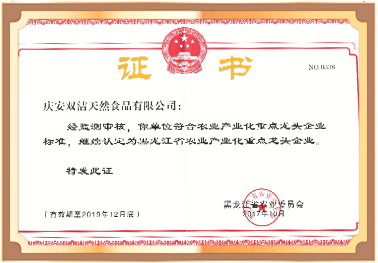 慶安雙潔天然食品有限公司認(rèn)定為黑龍江省農(nóng)業(yè)產(chǎn)業(yè)化重點(diǎn)龍頭企業(yè)